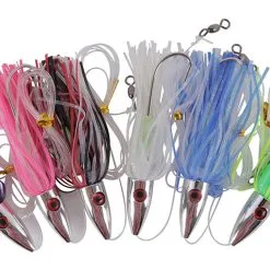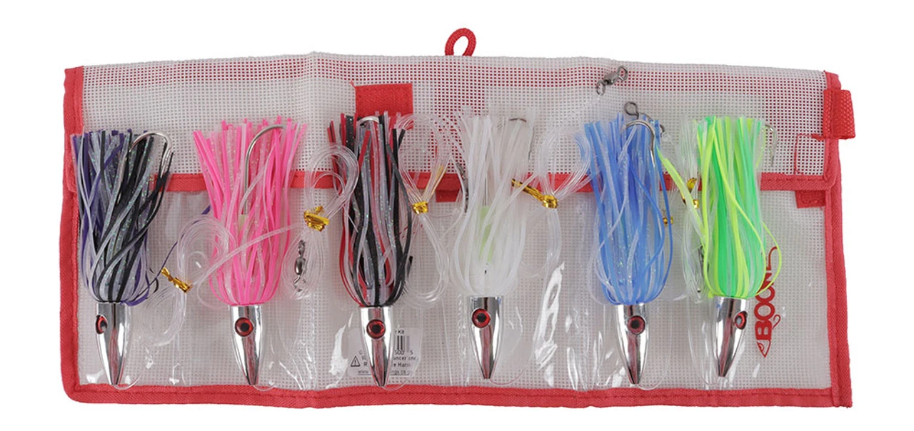The Boone Tuna Slayer Kit will help take your offshore tuna trolling spread to the next level. Featuring 6 pre rigged Tuna Slayer lures in all of the hottest colors including Black/Red, Blue, Green/Yellow, Purple, Pink, and Pearl White and rigged with 6 feet of 130lb monofilament leader material, a 7/0 Mustad stainless steel hook, and a convenient lure pack to neatly organize your new tuna lures. Each Tuna Slayer possesses a highly polished head and a premium vinyl skirt that will hold up to vicious tuna strikes on the troll, trip after trip. Perfect to pull in any position of your spread, from off of your riggers to your flat line positions, these true tracking trolling lures give off an attractive and highly visible bubble trail that draws in all species of tuna and others such as mahi mahi and even small billfish from the depths. Don?t get caught undergunned when the tuna bite gets hot, be sure to pick up the pre rigged Tuna Slayer Kit from Boone and slay the tuna on your next offshore trip.