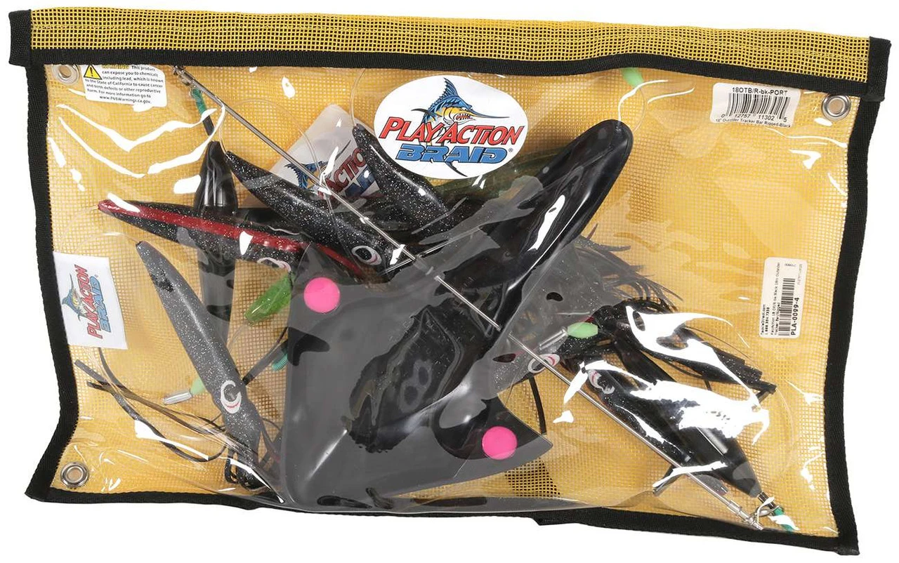 Increasing the width of your spread to ensure you’re covering the maximum amount of water, the PlayAction 18in Outsider Tracker Bars are a must have for those looking to maximize bites while trolling. These directional spreader bars are built on a 1/8in diameter stainless steel bar with an oversized 12in directional bird at the center. The bird rigs the center line in such a way that causes the bar to track outward in either the port or starboard direction. This feature allows the bar to run in a more visible location in the clean water outside the prop wash. The use of both a port and starboard side wide tracker bar can greatly increase the overall width of your spread and make room for you to run additional lines. The center and wing lines are rigged with two 5in Humming Birds and seven 9in blub squids to attract fish to the spread by simulating schooling bait skittering across the surface. The 9in Machine Stinger rigged with an 8/0 heavy duty southern tuna hook seals the deal once the fish are in range. All connection points are professionally crimped with chafe gear for maximum reliability. Each spreader bar comes with its own clear vinyl/mesh lure bag for easy storage and wash down.